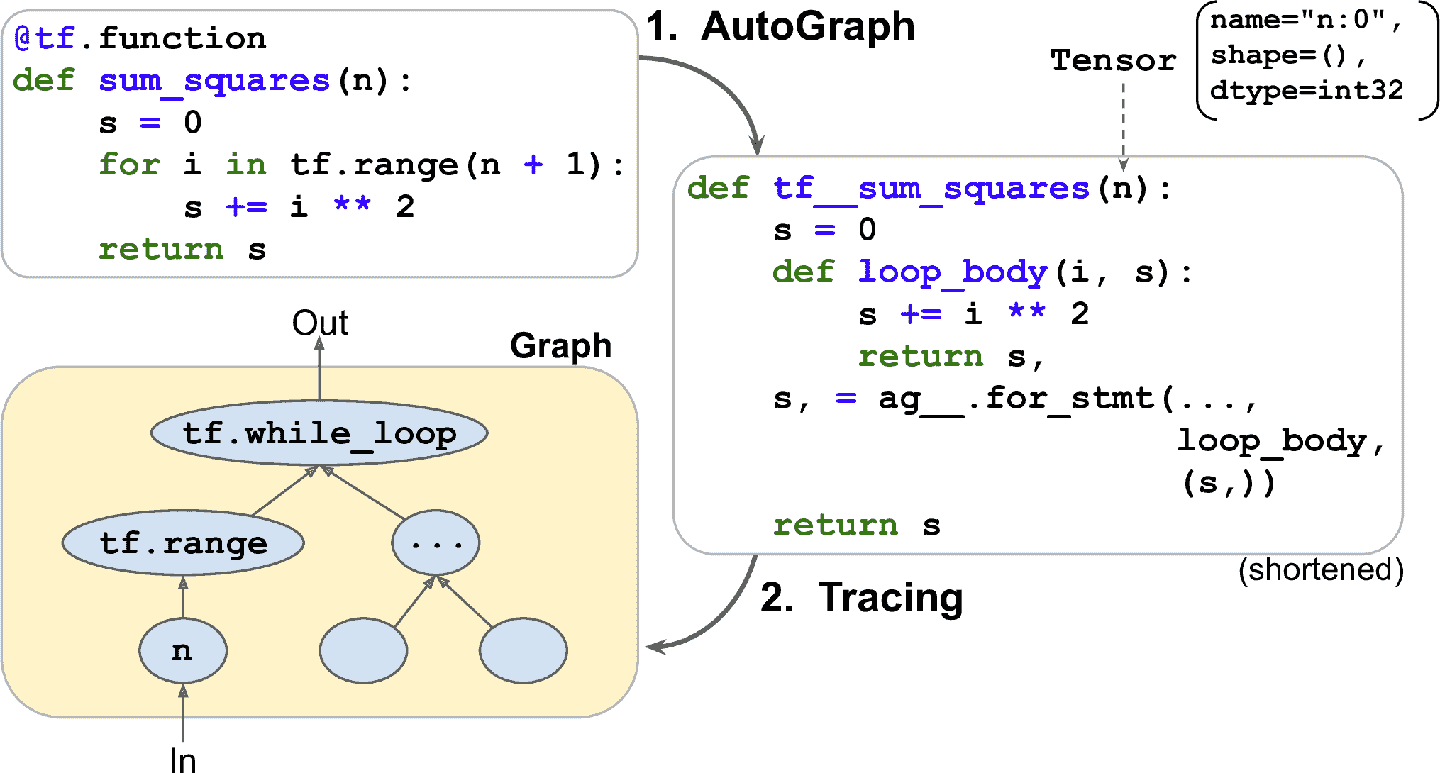 for循环。因此要确保使用for i in tf.range(x),而不是for i in range(x),否则循环不能在图中捕获,而是在会在追踪中运行。(如果for循环使用创建计算图的,这可能是你想要的,比如创建神经网络中的每一层)。 - 出于性能原因,最好使用向量化的实现方式,而不是使用循环。