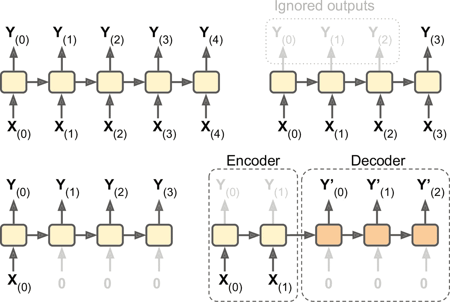 图 15-4 序列到序列(左上),序列到向量(右上),向量到序列(左下),延迟序列到序列(右下)