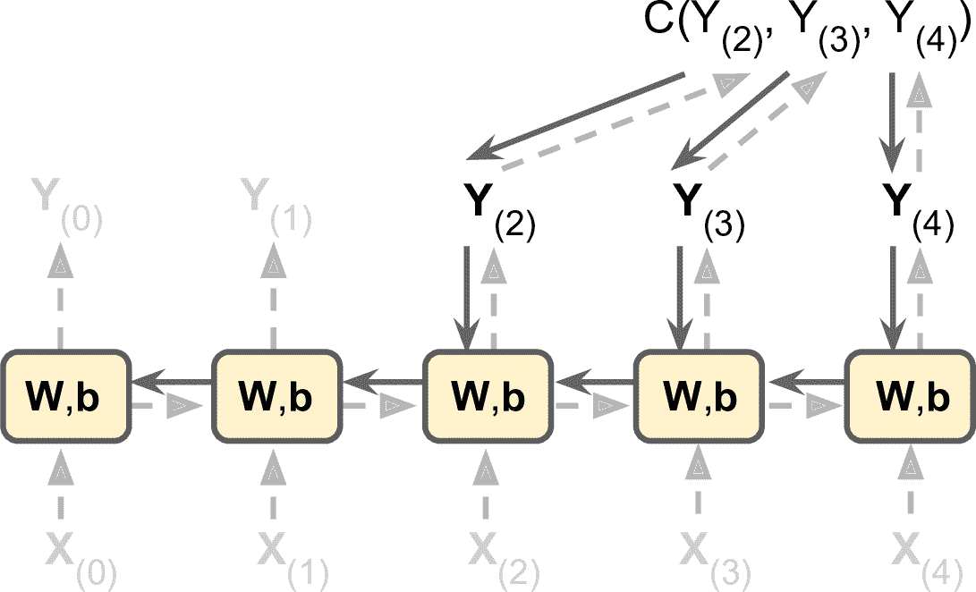 就像在正常的反向传播中一样,展开的网络(用虚线箭头表示)中先有一个正向传播(虚线)。然后使用损失函数C(Y[0], Y[1], …Y[T]])评估输出序列(其中T是最大时间步)。这个损失函数会忽略一些输出,见图 15-5(例如,在序列到向量的 RNN 中,除了最后一项,其它的都被忽略了)。损失函数的梯度通过展开的网络反向传播(实线箭头)。最后使用在 BPTT 期间计算的梯度来更新模型参数。注意,梯度在损失函数所使用的所有输出中反向流动,而不仅仅通过最终输出(例如,在图 15-5 中,损失函数使用网络的最后三个输出Y[2],Y[3]和Y[4],所以梯度流经这三个输出,但不通过Y[0]和Y[1]。而且,由于在每个时间步骤使用相同的参数W和b,所以反向传播将做正确的事情并对所有时间步求和。