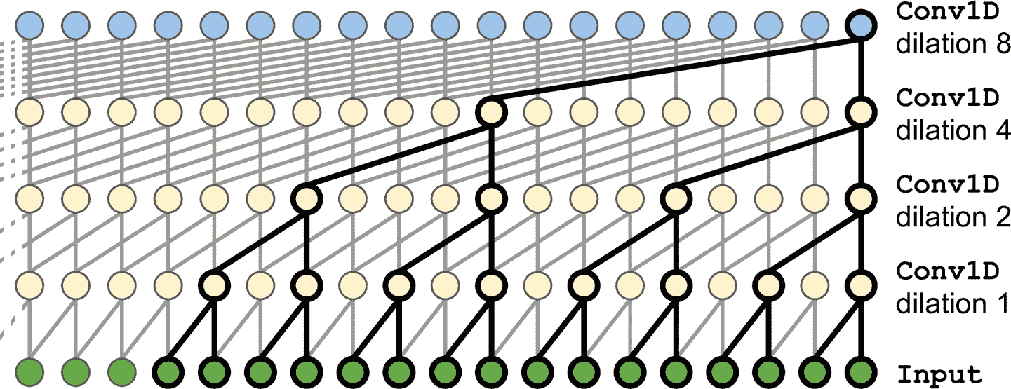 最后两个模型的序列预测结果最好!在 WaveNet 论文中,作者在多种音频任务(WaveNet 名字正是源于此)中,包括文本转语音任务(可以输出多种语言极为真实的语音),达到了顶尖的表现。他们还用这个模型生成音乐,每次生成一段音频。每段音频包含上万个时间步(LSTM 和 GRU 无法处理如此长的序列),这是相当了不起的。