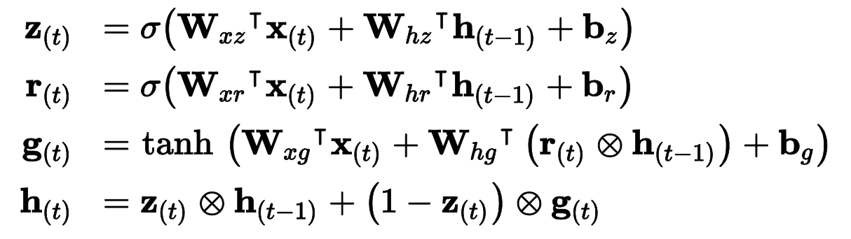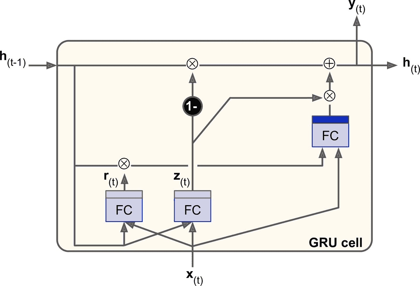 z[t]控制遗忘门和输入门。如果门控制器输出 1,则遗忘门打开(= 1),输入门关闭(1 - 1 = 0)。如果输出 0,则相反。换句话说,如果当有记忆要存储,那么就必须先在其存储位置删掉该处记忆。这构成了 LSTM 本身的常见变体。 - GRU 单元取消了输出门,每个时间步输出全态向量。但是,增加了一个控制门