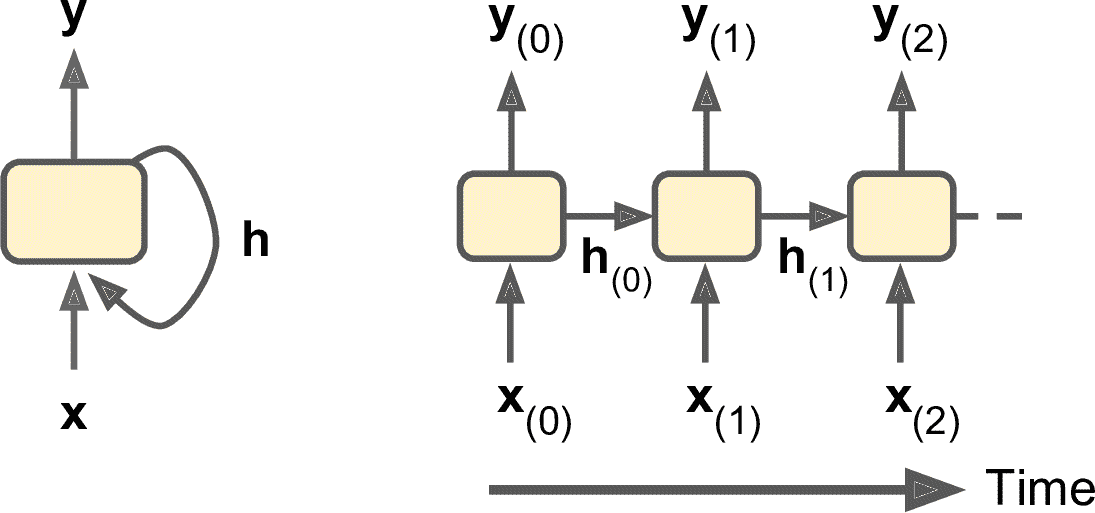 图 15-2 一层循环神经元(左),及其随时间展开(右)
