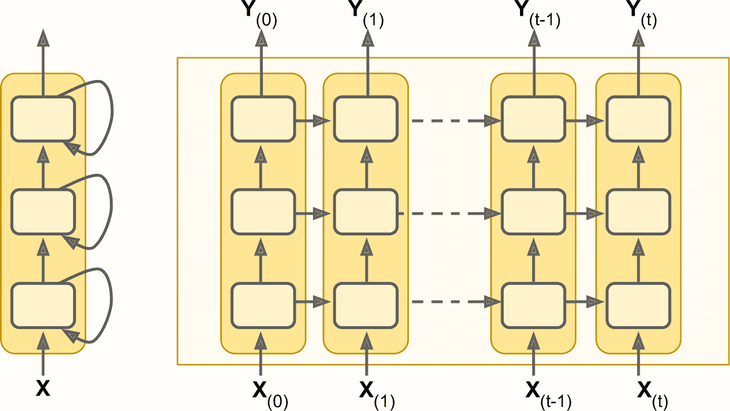 图 15-7 深度 RNN(左)和随时间展开的深度 RNN(右)