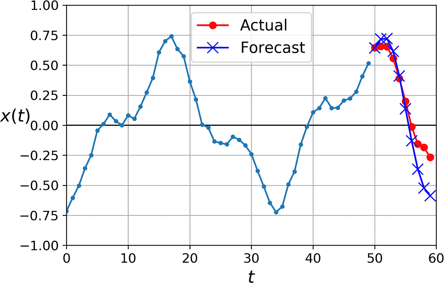 还有其它预测时间序列的模型,比如权重移动平均模型或自动回归集成移动平均(ARIMA)模型。某些模型需要先移出趋势和季节性。例如,如果要研究网站的活跃用户数,它每月会增长 10%,就需要去掉这个趋势。训练好模型之后,在做预测时,你可以将趋势加回来做最终的预测。相似的,如果要预测防晒霜的每月销量,会观察到明显的季节性:每年夏天卖的多。需要将季节性从时间序列去除,比如计算每个时间步和前一年的差值(这个方法被称为差分)。然后,当训练好模型,做预测时,可以将季节性加回来,来得到最终结果。