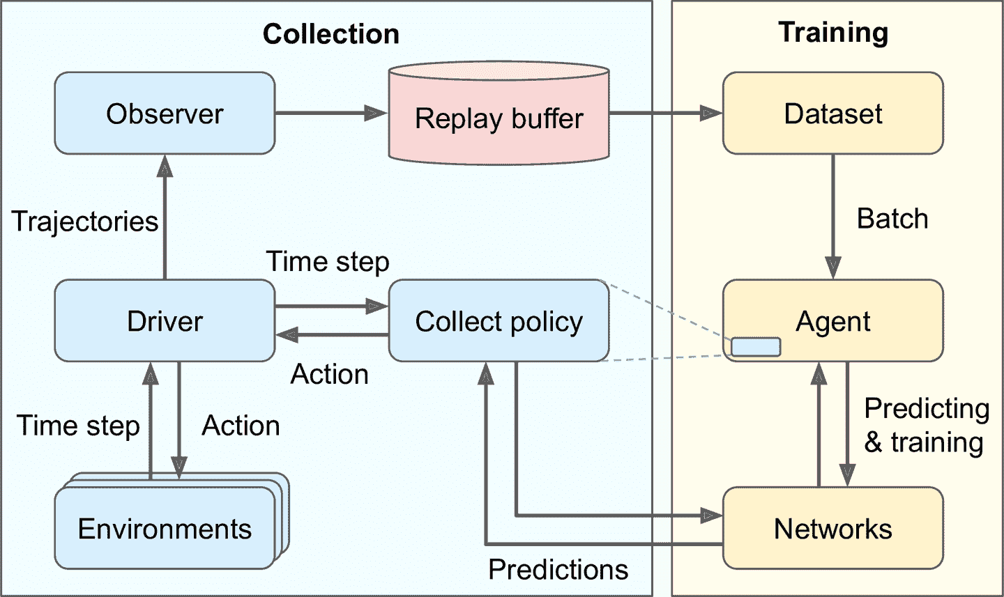另外,就像前面讨论的,环境可能是批次化的环境,这种情况下,驱动将批次化的时间步传给策略(即,时间步对象包含批次观察、批次步骤类型、批次奖励、批次衰减,这四个批次的大小相同)。驱动还传递前一批次的策略状态。然后,策略返回去批次动作步,包含着批次动作和批次策略状态。最后,驱动创建批次化轨迹(即,轨迹包含批次步骤类型、批次观察、批次动作、批次奖励,更一般地,每个轨迹属性一个批次,所有批次大小相同)。