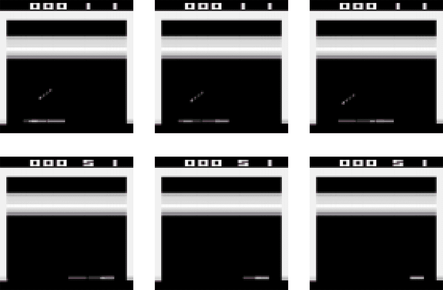 trajectories对象是一个命名元组,有 7 个字段。每个字段包含一个张量,前两个维度是 2 和 3(因为有两条轨迹,每个三个时间步)。这解释了为什么observation字段的形状是[2, 3, 84, 84, 4]:这是两条轨迹,每条轨迹三个时间步,每步的观察是84 × 84 × 4。相似的,step_type张量的形状是[2, 3]:在这个例子中,两条轨迹包含三个连续步骤,步骤是在周期的中部,(类型是1, 1, 1)。在第二条轨迹中,看不到第一个观察中左下方的球,在接下来的两个观察中,球消失了,所以智能体会死,但周期不会马上结束,因为还剩几条命。