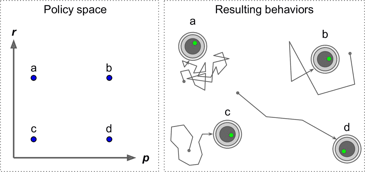 图 18-3 策略空间中的四个点以及机器人的对应行为