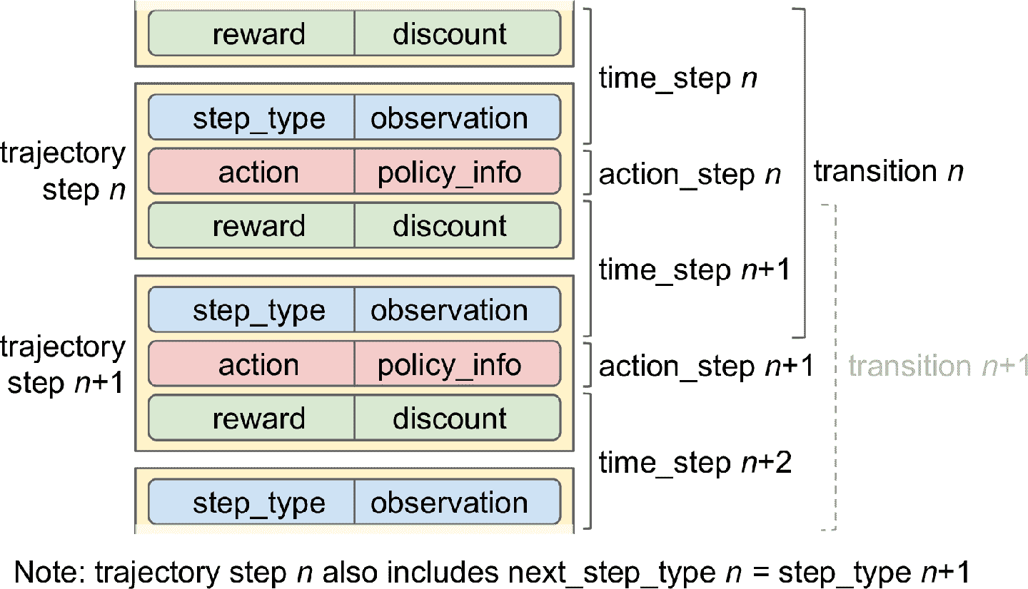 每条轨迹是连续时间步和动作步的简洁表征,初衷是为了避免繁琐,怎么做呢?见图 18-16,过渡n由时间步n、动作步n、时间步n+1组成,而过渡n+1由时间步n+1、动作步n+1、时间步n+2。如果将这两个过渡直接存入接力缓存,时间步是重复的。为了避免重复,第n个轨迹步只包括时间步n的类型和观察(不是奖励和衰减),不包括时间步的观察(但是,不包括下一个时间步类型的复制)。
