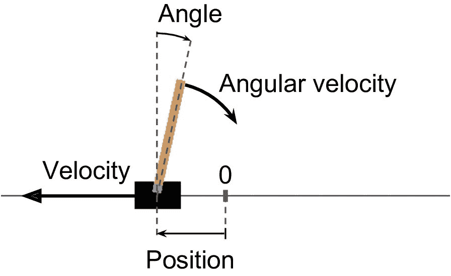 这里创建了一个 CartPole 环境。这是一个 2D 模拟,其中推车可以被左右加速,以平衡放置在它上面的平衡杆(见图 18-4)。你可以用gym.envs.registry.all()获得所有可用的环境。在创建环境之后,需要使用reset()初始化。这会返回第一个观察结果。观察取决于环境的类型。对于 CartPole 环境,每个观测是包含四个浮点数的 1D Numpy 向量:这些浮点数代表推车的水平位置(0.0 为中心)、速度(正是右)、杆的角度(0.0 为垂直)及角速度(正为顺时针)。