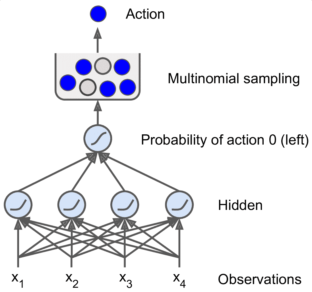 智能体用于改变行为的算法称为策略。例如,策略可以是一个把观测当输入,行为当做输出的神经网络(见图 16-2)。