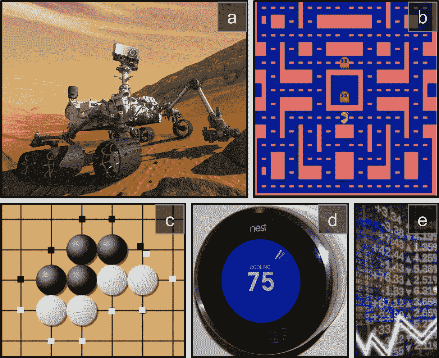 图 18-1 强化学习案例:(a)行走机器人,(b)Ms.Pac-Man 游戏,(c)围棋玩家,(d)恒温器,(e)自动交易员