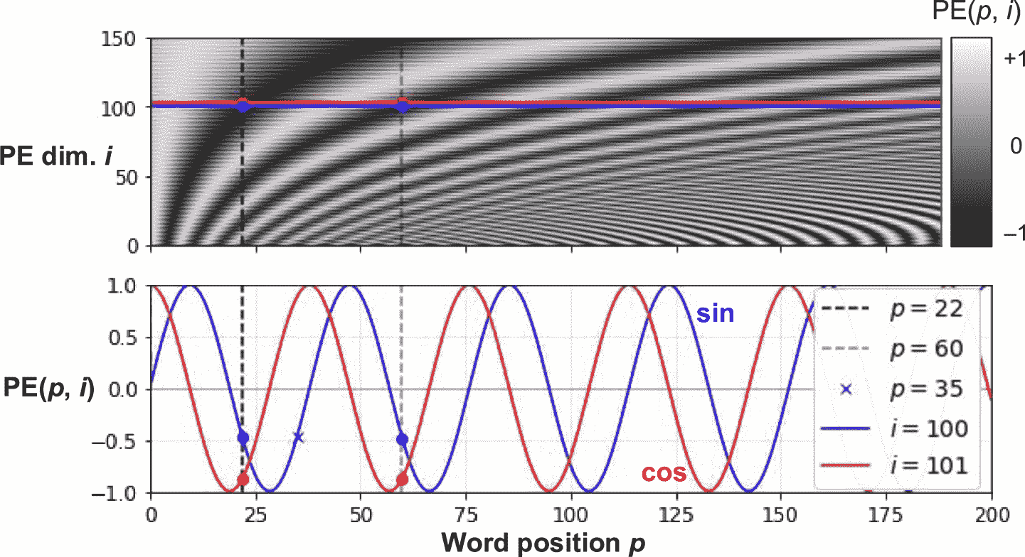 这个方法的效果和学习过的位置嵌入相同,但可以拓展到任意长度的句子上,这是它受欢迎的原因。给词嵌入加上位置嵌入之后,模型剩下的部分就可以访问每个词在句子中的绝对位置了,因为每个值都有一个独立的位置嵌入(比如,句子中第 22 个位置的词的位置嵌入,表示为图 16-9 中的左下方的垂直虚线,可以看到位置嵌入对这个位置是一对一的)。另外,振动函数(正弦和余弦)选择也可以让模型学到相对位置。例如,相隔 38 个位置的词(例如,在位置p=22和p=60)总是在嵌入维度i=100和i=101有相同的位置嵌入值,见图 16-9。这解释了对于每个频率,为什么需要正弦和余弦两个函数:如果只使用正弦(蓝线,i=100),模型不能区分位置p=25和p=35(叉子标记)。