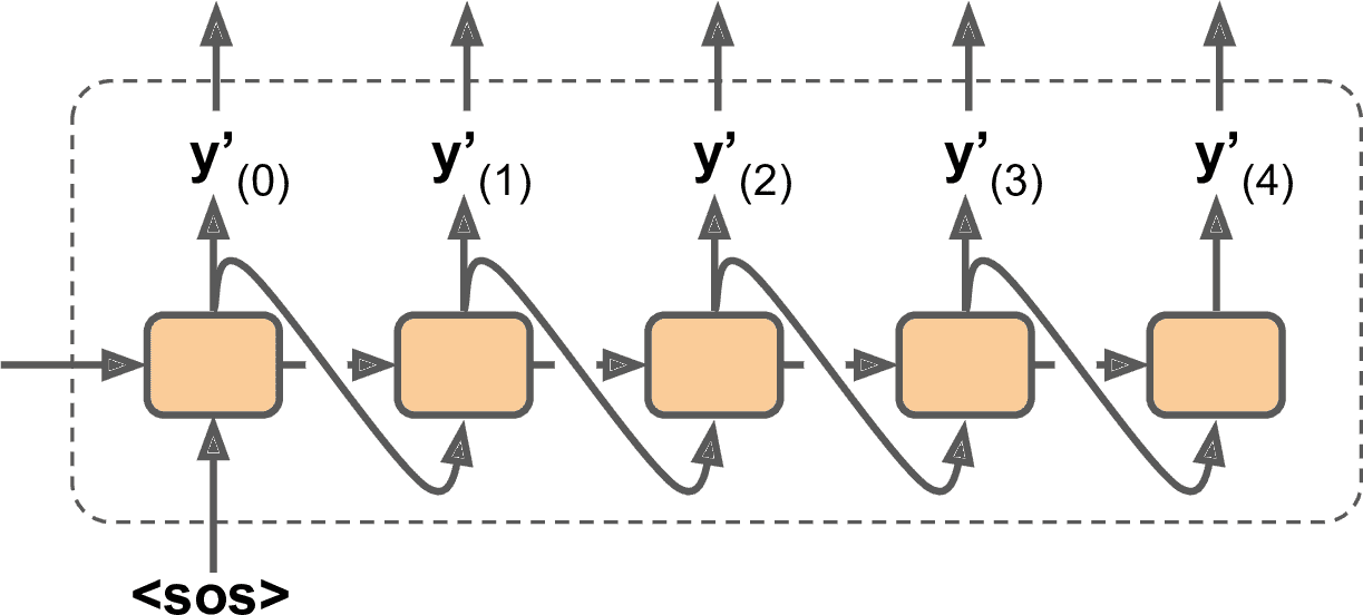 N次,编码器的最终输出,传入给解码器重叠层中的每一个部分。和以前一样,在每个时间步,解码器输出每个下一个可能词的概率(输出形状是[批次大小, 最大输出句子长度, 词典长度])。 - 在推断时,解码器不能接收目标,所以输入的是前面的输出词(起点用 SOS 标记)。因此模型需要重复被调用,每一轮预测一个词(预测出来的词在下一轮输入给解码器,直到输出 EOS 标记)。