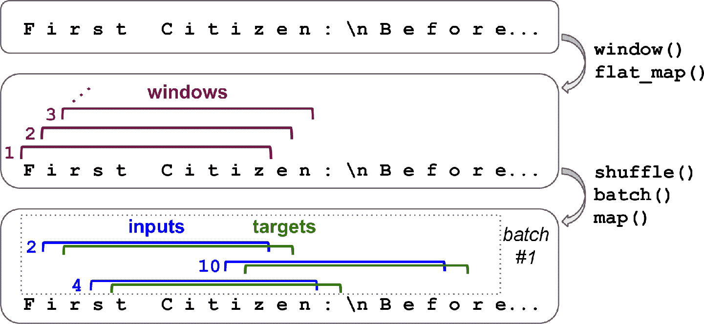 我们在每个窗口上调用了batch(window_length):因为所有窗口都是这个长度,对于每个窗口,都能得到一个独立的张量。现在的数据集包含连续的窗口,每个有 101 个字符。因为梯度下降在训练集中的实例独立同分布时的效果最好,需要打散这些窗口。然后我们可以对窗口做批次,分割输入(前 100 个字符)和目标(最后一个字符):