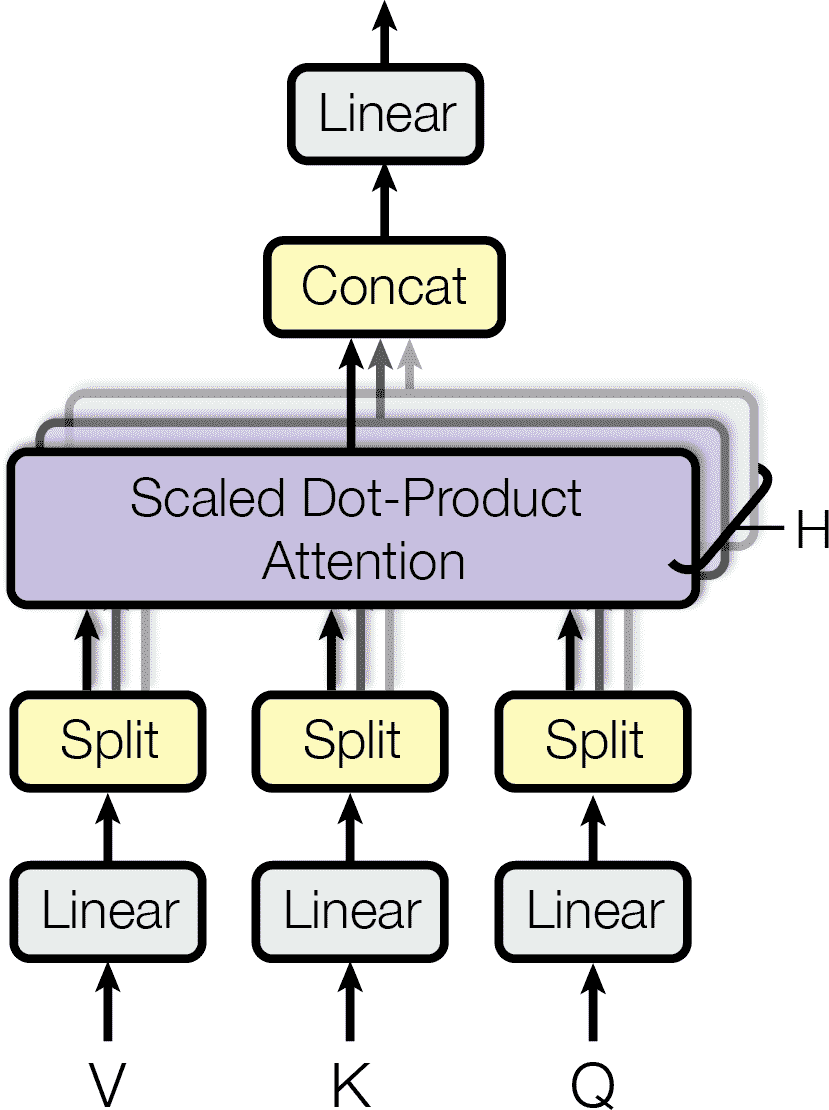 可以看到,它包括一组缩放点积注意力层,每个前面有一个值、键、查询的线性变换(即,时间分布紧密层,没有激活函数)。所有输出简单连接起来,再通过一个最终的线性变换。为什么这么做?这个架构的背后意图是什么?考虑前面讨论过的单词played。编码器可以将它是动词的信息做编码。同时,词表征还包含它在文本中的位置(得益于位置嵌入),除此之外,可能还包括了其它有用的信息,比如时态。总之,词表征编码了词的许多特性。如果只用一个缩放点积注意力层,则只有一次机会来查询所有这些特性。这就是为什么多头注意力层使用了多个不同的值、键、查询的线性变换:这可以让模型将词表征投影到不同的亚空间,每个关注于词特性的一个子集。也许一个线性层将词表征投影到一个亚空间,其中的信息是该词是个动词,另一个线性层会提取它是一个过去式,等等。然后缩放点积注意力做查询操作,最后将所有结果串起来,在投射到原始空间。