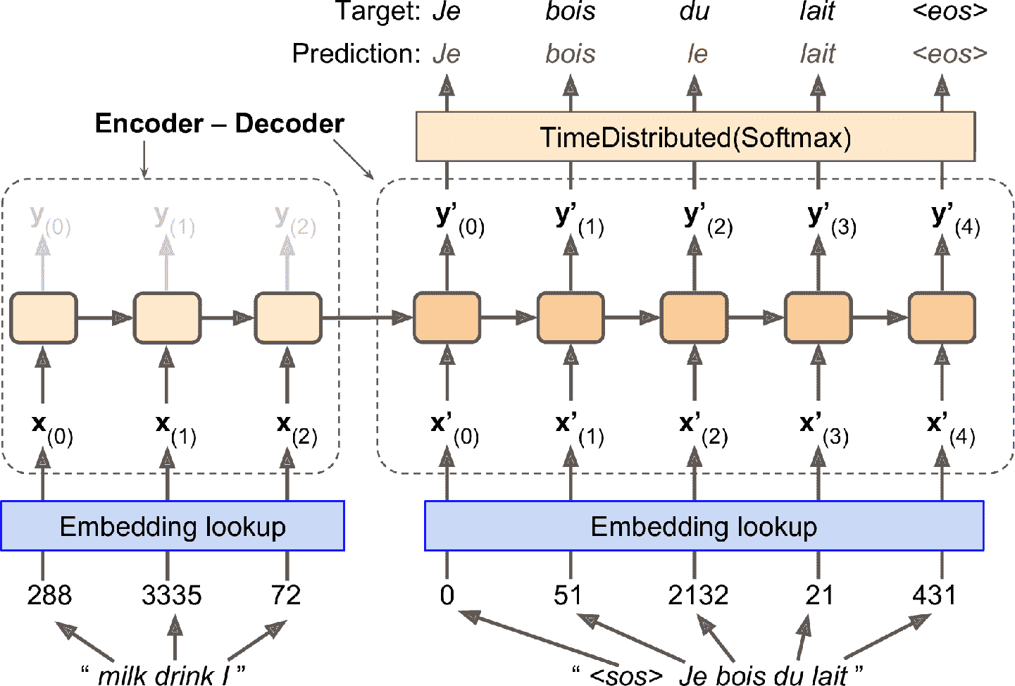 - 图的左边和以前一样是编码器,接收的输入是一个批次的句子,表征为序列化的单词 ID(输入的形状是