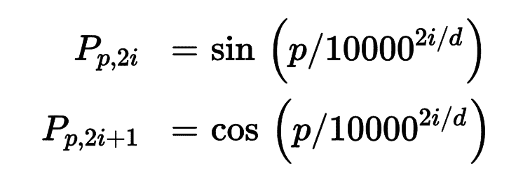 位置嵌入是一个紧密向量,它对词在句子中的位置进行编码:第i个位置嵌入添加到句子中的第i个词。模型可以学习这些位置嵌入,但在论文中,作者倾向使用固定位置嵌入,用不同频率的正弦和余弦函数来定义。公式 16-2 定义了位置嵌入矩阵P,见图 16-9 的底部(做过转置),其中P[p, i]是单词在句子的第p个位置的第i个嵌入的组件。