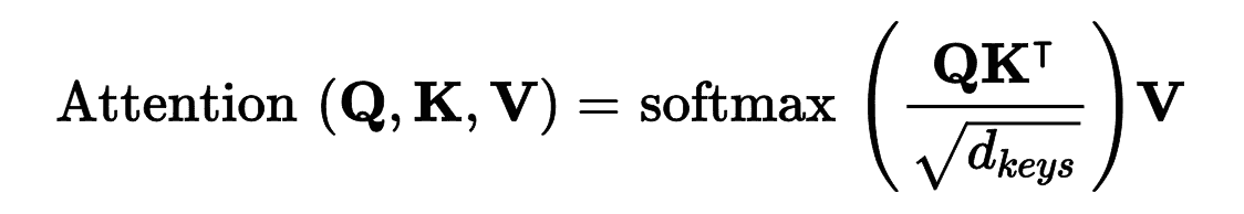 Q矩阵每行是一个查询词。它的形状是[n_queries, d_keys],n_queries是查询数,d_keys是每次查询和每个键的维度数。K矩阵每行是一个键。它的形状是[n_keys, d_keys],n_keys是键和值的数量。V矩阵每行是一个值。它的形状是[n_keys, d_values],d_values是每个值的数。Q K^T的形状是[n_queries, n_keys]:它包含这每个查询/键对的相似分数。softmax 函数的输出有相同的形状,且所有行的和是 1。最终的输出形状是[n_queries, d_values],每行代表一个查询结果(值的加权和)。- 缩放因子缩小了相似度分数,防止 softmax 函数饱和(饱和会导致梯度变小)。