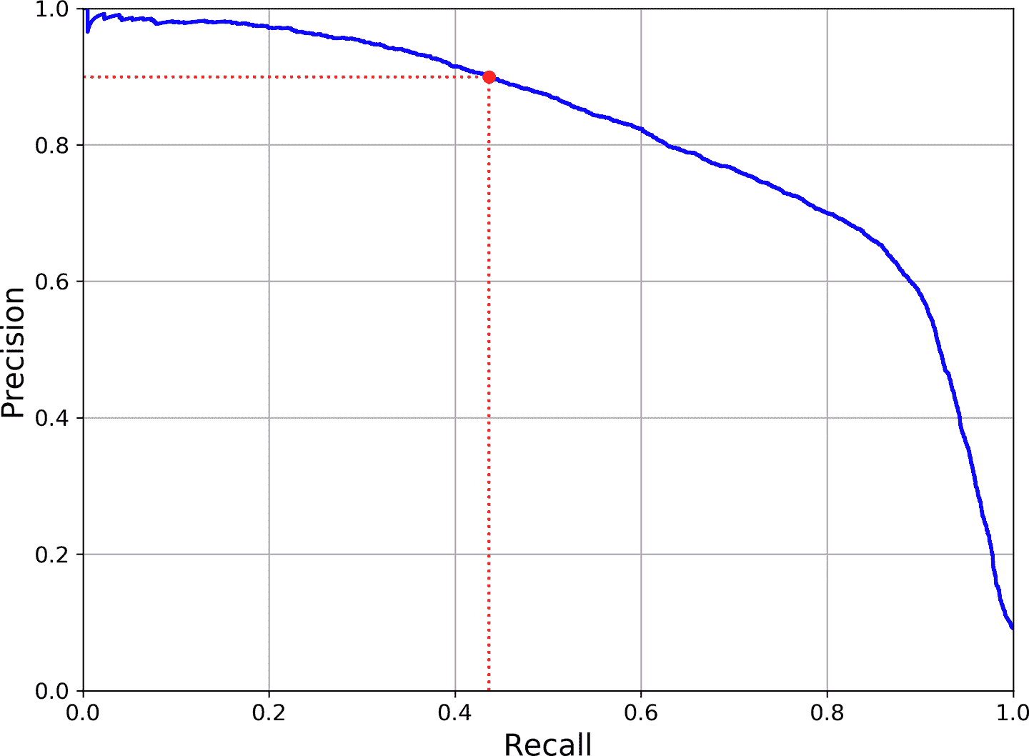 假设当召回率为 10% 时,分类器的精确率是 90%,召回率为 20% 时,精确率是 96%。这里就没有取舍关系:使用召回率为 20% 的分类器就好,因为此时精确率更高。所以当召回率至少有 10% 时,需要找到最高精确率,即 96%。因此,一个衡量模型性能的方法是计算召回率至少为 0% 时,计算最大精确率,再计算召回率至少为 10% 时的最大精确率,再计算召回率至少为 20% 时的最大精确率,以此类推。最后计算这些最大精确率的平均值,这个指标称为平均精确率(Average Precision,AP)。当有超过两个类时,可以计算每个类的 AP,然后计算平均 AP(即,mAP)。就是这样!