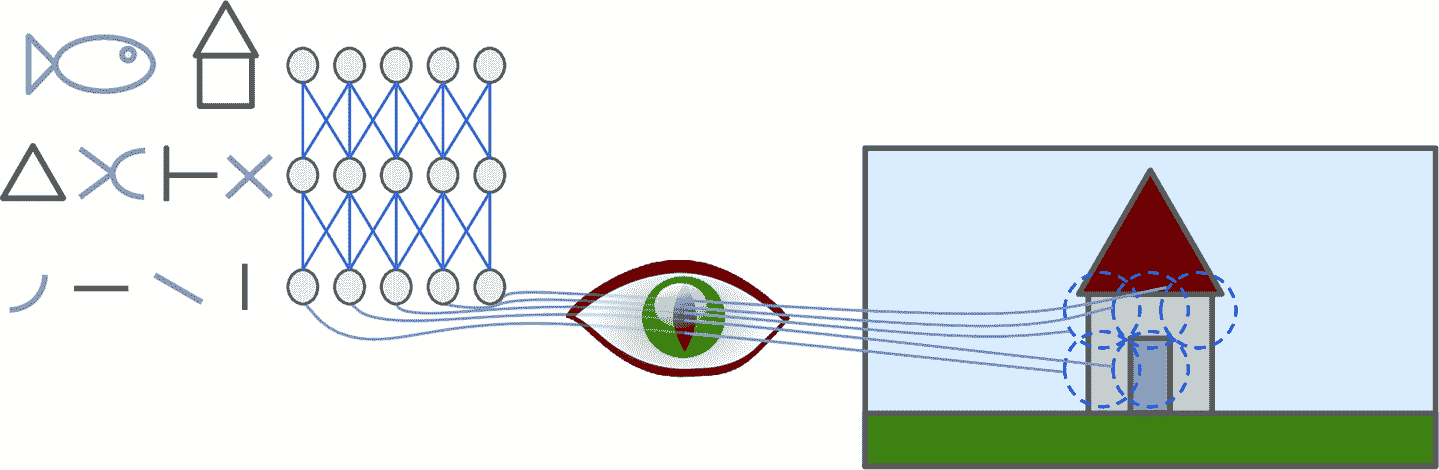 图 14-1 视神经中生物神经元可以对感受野中的图案作反应;当视神经信号上升时,神经元可以反应出更大感受野中的更为复杂的图案