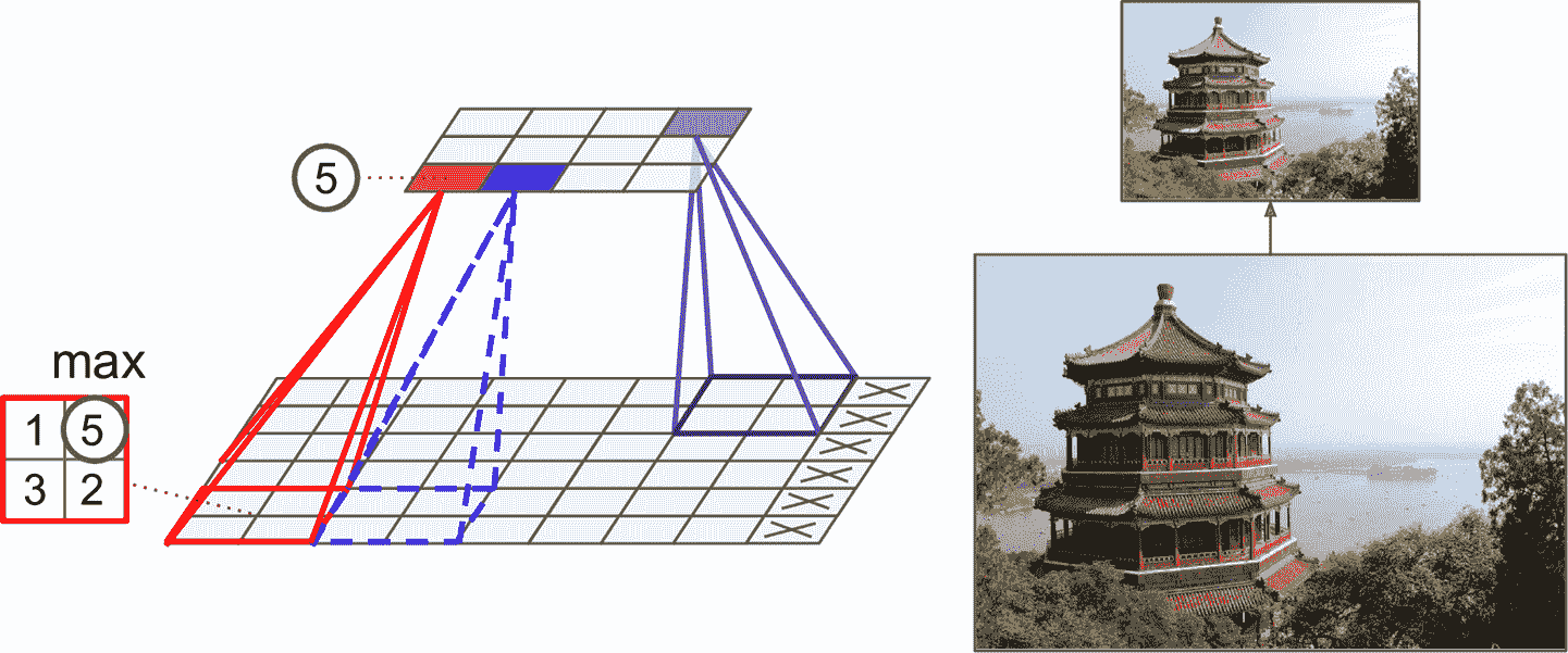 明白卷积层的原理了,池化层就容易多了。池化层的目的是对输入图片做降采样(即,收缩),以降低计算负载、内存消耗和参数的数量(降低过拟合)。