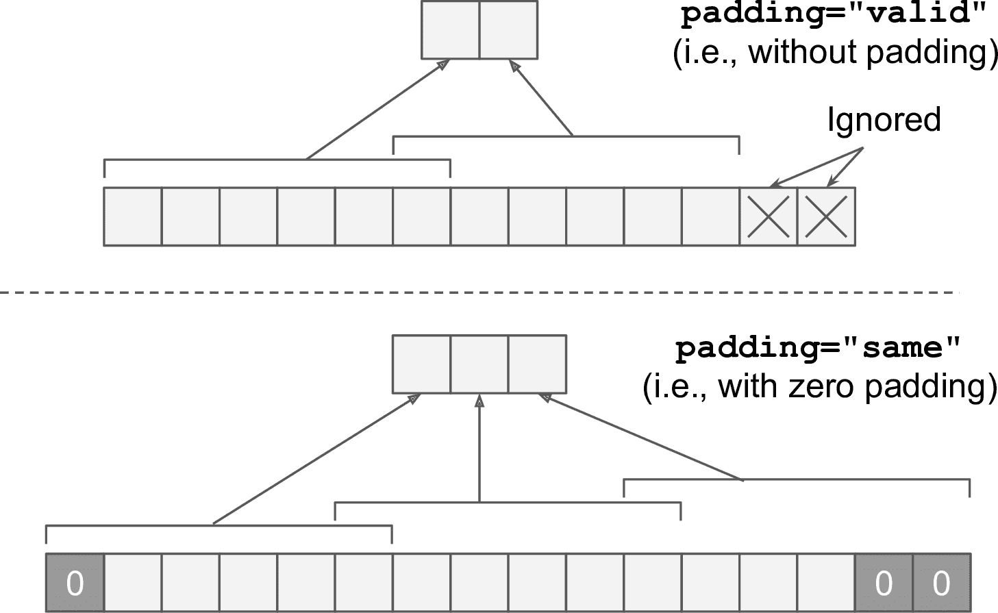 "valid",卷积层就不使用零填充,取决于步长,可能会忽略图片的输入图片的底部或右侧的行和列,见图 14-7(简单举例,只是显示了水平维度)。这意味着每个神经元的感受野位于严格确定的图片中的位置(不会越界),这就是valid的来历。