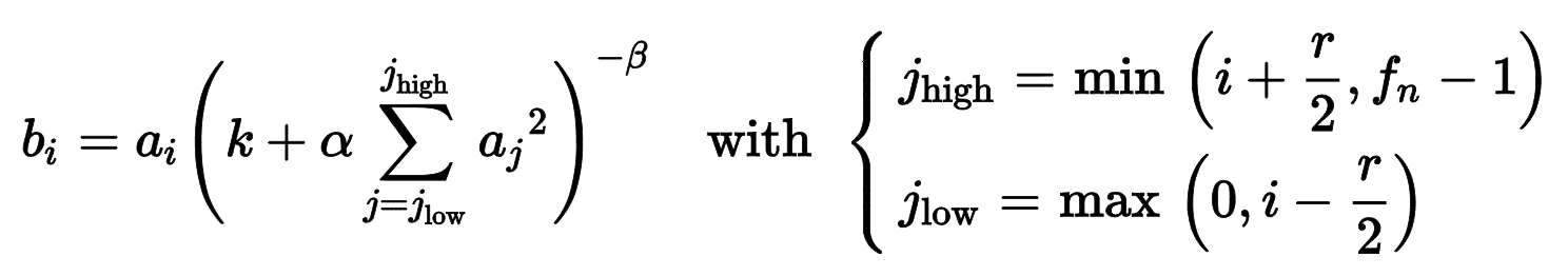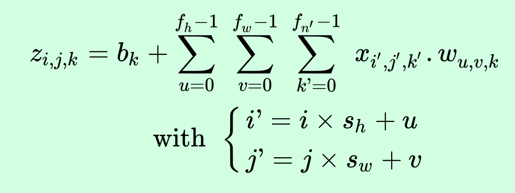 z[i, j, k]是卷积层l中第i行、第j列、特征映射k的输出。s[h]和s[w]是垂直和水平步长,f[h]和f[w]是感受野的高和宽,f[n']是前一层l-1的特征映射数。x[i', j', k']是卷积层l-1中第i'行、第j'列、特征映射k'的输出(如果前一层是输入层,则为通道k')。b[k]是特征映射k的偏置项。可以将其想象成一个旋钮,可以调节特征映射 k 的明亮度。w[u, v, k′ ,k]是层l的特征映射k的任意神经元,和位于行u、列v(相对于神经元的感受野)、特征映射k'的输入,两者之间的连接权重。