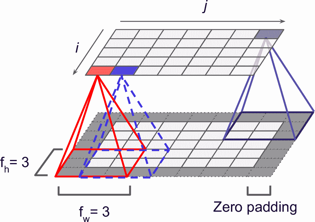 位于给定层第i行、第j列的神经元,和前一层的第i行到第i + fh – 1行、第j列到第j + fw – 1列的输出相连,f[h]和f[w]是感受野的高度和宽度(见图 14-3)。为了让卷积层能和前一层有相同的高度和宽度,通常给输入加上 0,见图,这被称为零填充(zero padding)。