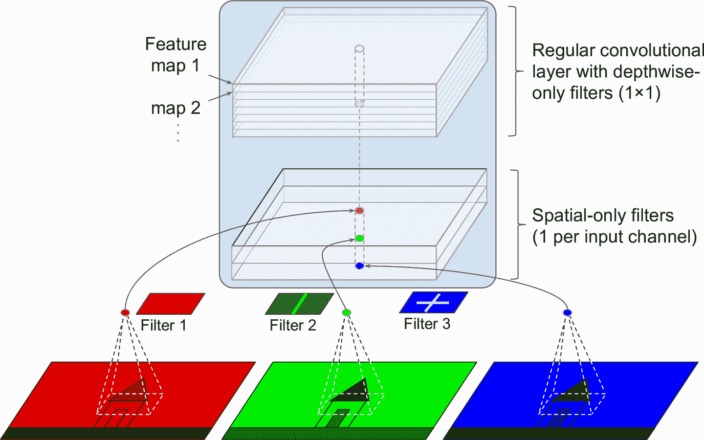 tf.nn.depthwise_conv2d():可以用来创建深度方向卷积层(但需要自己创建参数)。它将每个过滤器应用到每个独立的输入通道上。因此,因此,如果有f[n]个过滤器和f[n']个输入通道,就会输出f[n] x f[n']个特征映射。